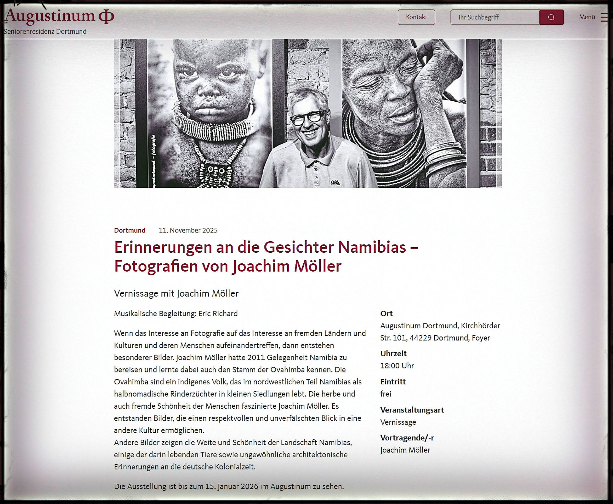 „Lieber Herr Möller, ich habe mich sehr gefreut, Sie heute beim Hängen Ihrer Fotos im Augustinum kennen gelernt zu haben. Sie waren bereit, mit mir ein bisschen zu plaudern und haben gesagt, Sie seien kein Profifotograf. Da ist erheblicher Widerspruch erforderlich!!! Ein erster flüchtiger Blick in Ihre Sammlung im Internet lässt nur die Bezeichnung zu: Profi (im Sinne von fotografischer Kompetenz und künstlerischer Intelligenz) der Sonderklasse! Alle Aufnahmen, die Sie online zur Verfügung gestellt haben, werde ich mir in aller Ruhe ansehen, sicherlich mehrfach. … In meinem Bekanntenkreis außerhalb des Augustinums werde ich davon berichten, dass ich einen Fotografen aus Dortmund kenne, der einen besonderen Blick für das Motiv in verschiedenen Situationen hat, eine Vielfalt von Themen beherrscht und das in künstlerischer Weise darzustellen weiß. Ich bin begeistert. … Ich bin davon überzeugt, dass auch viele andere Ihre Arbeit sehr schätzen werden. Ihnen vielen Dank. Mit herzlichem Gruß > Klaus Dankert“