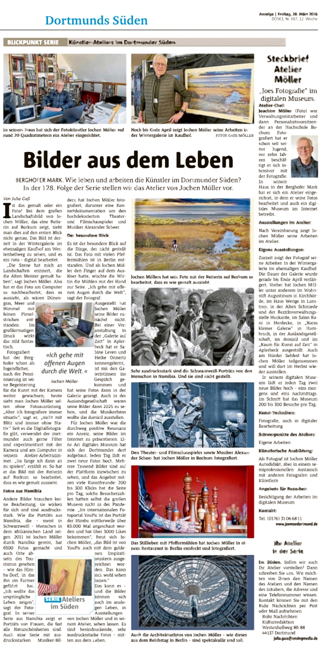 „Lieber Herr Möller, ich habe mich sehr gefreut, Sie heute beim Hängen Ihrer Fotos im Augustinum kennen gelernt zu haben. Sie waren bereit, mit mir ein bisschen zu plaudern und haben gesagt, Sie seien kein Profifotograf. Da ist erheblicher Widerspruch erforderlich!!! Ein erster flüchtiger Blick in Ihre Sammlung im Internet lässt nur die Bezeichnung zu: Profi (im Sinne von fotografischer Kompetenz und künstlerischer Intelligenz) der Sonderklasse! Alle Aufnahmen, die Sie online zur Verfügung gestellt haben, werde ich mir in aller Ruhe ansehen, sicherlich mehrfach. … In meinem Bekanntenkreis außerhalb des Augustinums werde ich davon berichten, dass ich einen Fotografen aus Dortmund kenne, der einen besonderen Blick für das Motiv in verschiedenen Situationen hat, eine Vielfalt von Themen beherrscht und das in künstlerischer Weise darzustellen weiß. Ich bin begeistert. … Ich bin davon überzeugt, dass auch viele andere Ihre Arbeit sehr schätzen werden. Ihnen vielen Dank. Mit herzlichem Gruß“